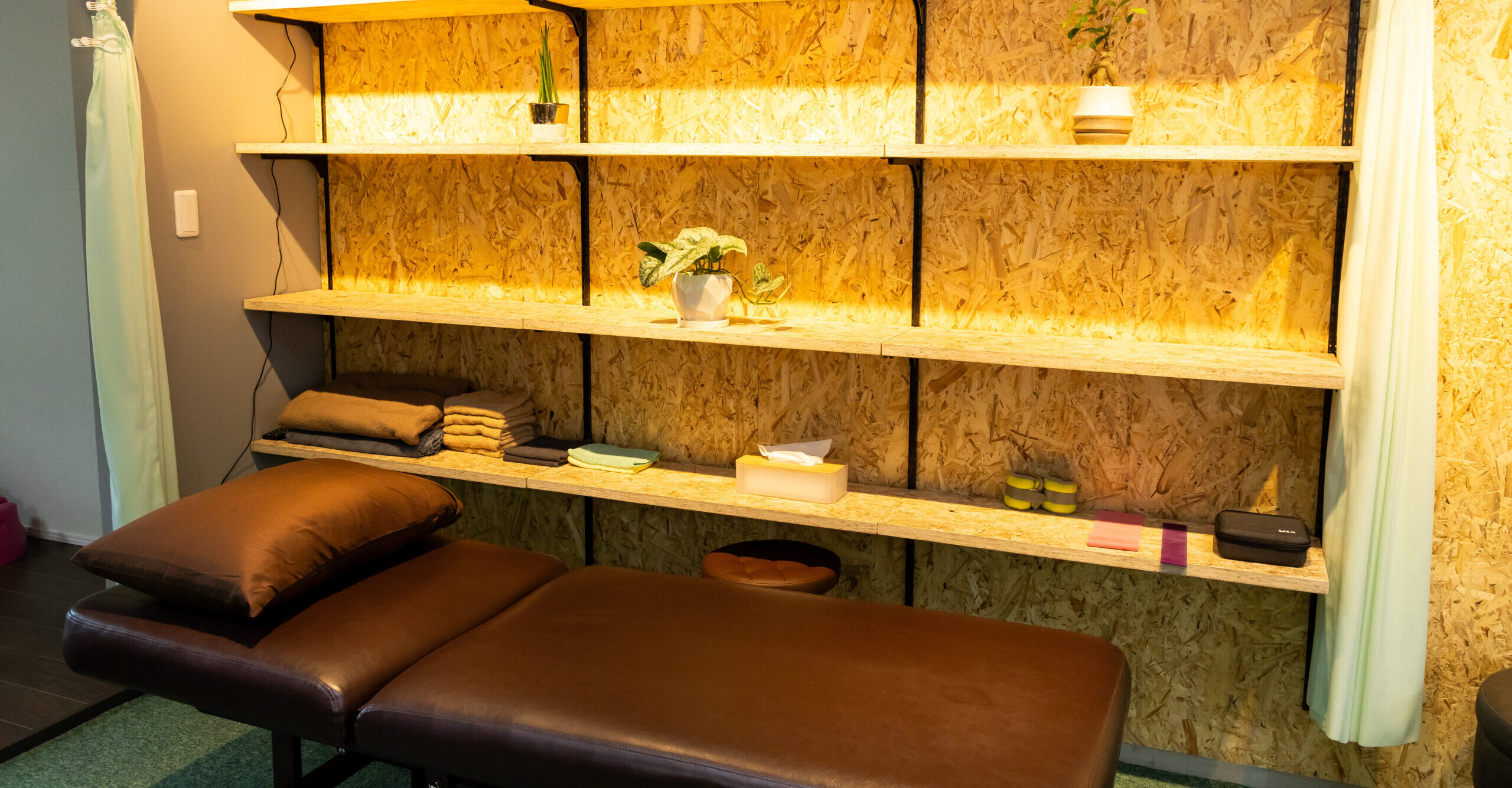 緑と茶色も自然をイメージしたリラックス出来る空間での施術をご堪能ください!